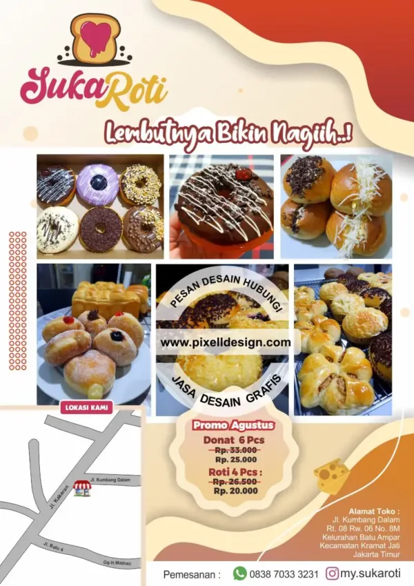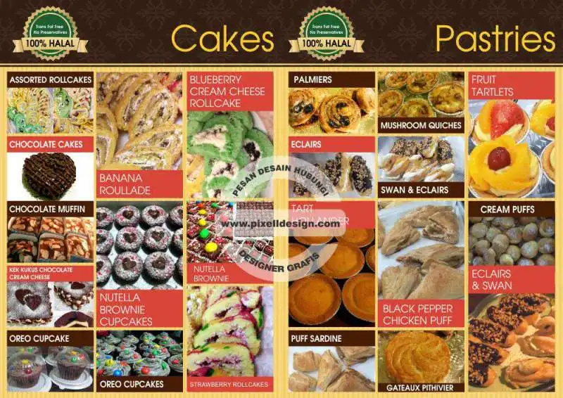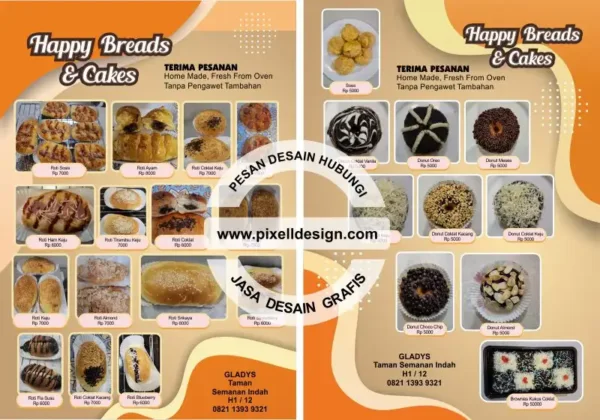 Contoh brosur ini menampilkan produk roti dan kue yang disajikan secara menarik dan menggugah selera. Dalam pembuatan brosur ini, hal yang perlu diperhatikan adalah penampilan dari foto makanan yang menarik dengan penjelasan singkat tentang produk di dalam brosur agar konsumen dapat langsung memahami informasi yang ada. Penggunaan ukuran kertas brosur yang tepat dan model brosur yang menggambarkan konsep dari roti dan kue juga perlu diperhatikan.