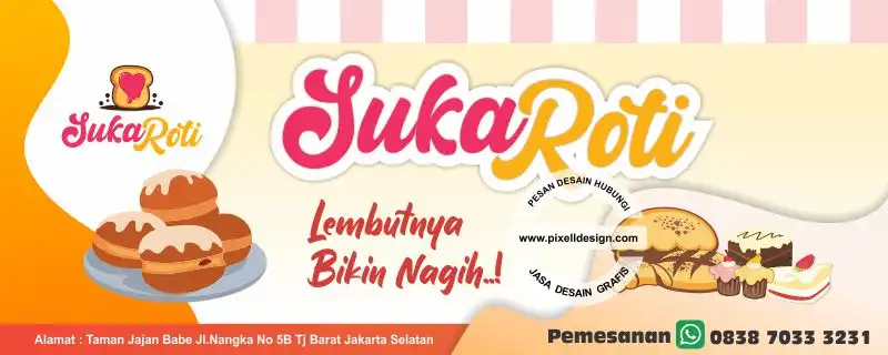 Logo “SukaRoti” cukup unik dengan ikon hati dan roti di bagian atas kiri banner. Ini memperkuat identitas merek dan membuatnya mudah diingat.