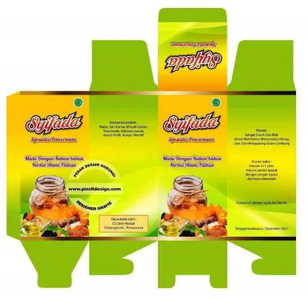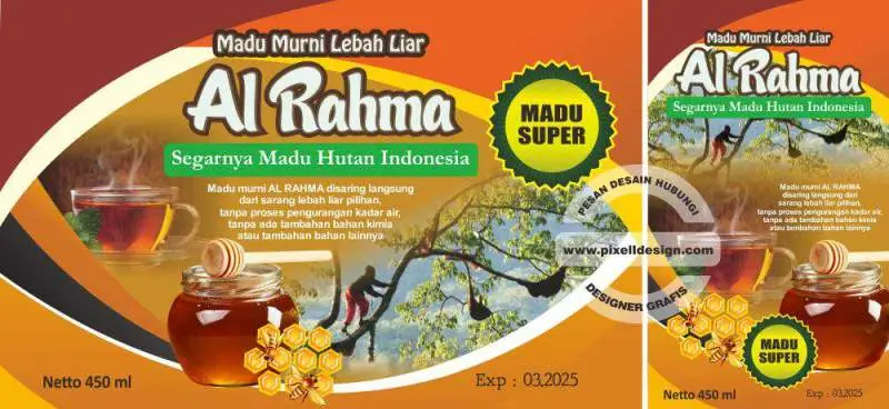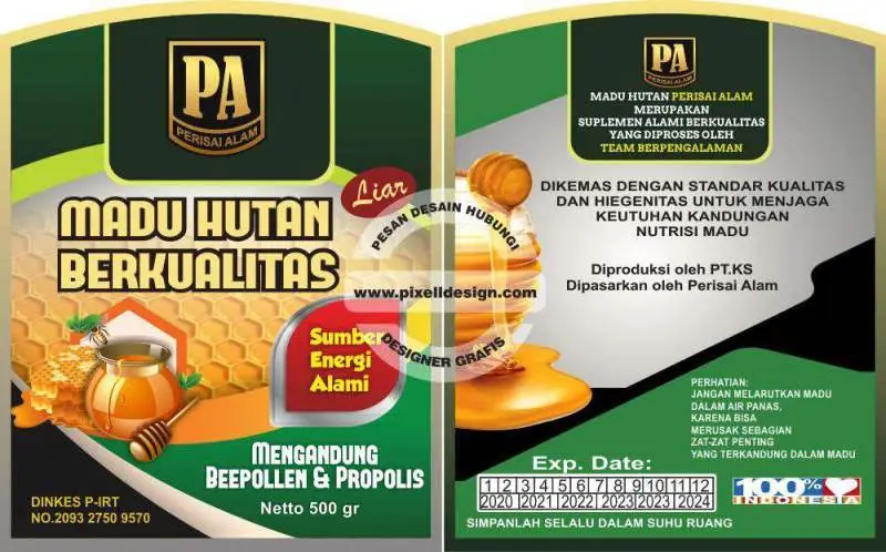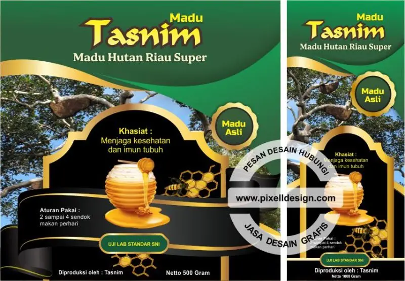 - Akan sangat bagus jika corak desain baik untuk kemasan luar maupun label dibuat exclusive sehingga mencermikan madu tersebut berkualitas dan diolah secara higienis. Jika anda tidak bisa mendesain sendiri, bisa menggunakan jada desain dari Pixell Design yang sudah berpengalaman dalam melakukan pembuatan kemasan madu.