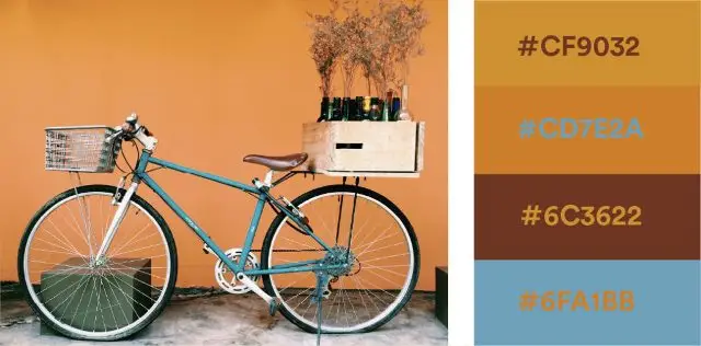 Palet warna ini terinspirasi dari warna musim gugur yang cerah dan bersahaja. Marigold, coklat tua, dan biru beryl memberikan kesan yang hangat, nyaman, dan menawan di dalam sebuah desain. Kombinasi warna ini cocok untuk kemasan produk, dekorasi interior, dan warna dinding.